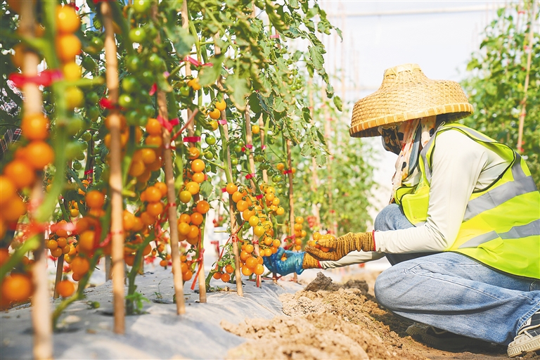 2094个农作物新品种亮相三亚崖州区国家现代农业(种业)产业园的农作物新品种新技术田间展示推广中心基地。图为工作人员在田间管护番茄。