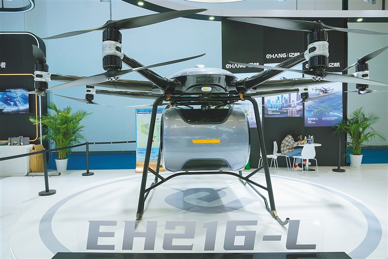 无需传统机场,即可实现灵活起降——在低空经济展示专区,多款eVTOL(电动垂直起降)航空器“同台竞技”,开启智能立体出行新时代。“我们的载人版机型计划明年完成适航取证,投入观光旅游、空中点对点交通等场景的试点运营。”峰飞航空科技有限公司高级副总裁孙铭介绍。