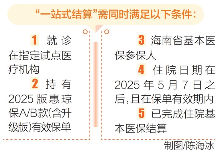 “一站式”结算可称之为直赔,出院结算即实时赔付。“惠琼保”参保人在试点医院发生的医疗费用,若满足一站式理赔条件,经基本医保结算后,剩余医药费用符合“惠琼保”2025版责任赔付范围的,在出院结算时即可实现与基本医保一起实时结算。